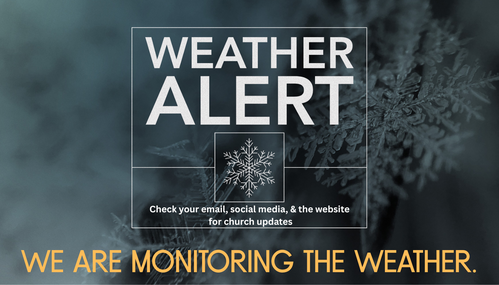 Our leadership team is closely monitoring the weather reports for any potential inclement conditions that could impact our services and events. Wednesday and Thursday groups will proceed as scheduled. Watch for updated communications via e-mail, social media, & on this website.